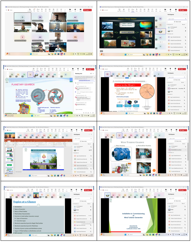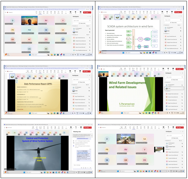 The Skill Development & Training (SDT) Division of NIWE has successfully conducted the Special Online Training Course on "Wind Energy Technology" during 19th, 20th, 25th and 27th February 2025. The course addressed all aspects of Wind Power starting from Introduction to Wind Energy and Global Wind Energy Scenario, Overview of Wind Turbine Components, Design Aspects of Wind Turbine, Aerodynamic aspects of Wind Turbine, Wind Turbine Gear Box and Drive Train concepts, Wind Turbine Generators, Installation and Commissioning of Wind Turbine, SCADA and Condition monitoring system of Wind Farms, Operation and Maintenance aspects of Wind Farms, Wind Farm Developments and Related Issues, Control and Protection system of Wind Turbine and Wind Turbine Tower and Foundation concepts. The course was attended by 15 participants. During the 4 days course, 12 lectures were scheduled. The course content of the training were handled by Scientists and Engineers of NIWE.