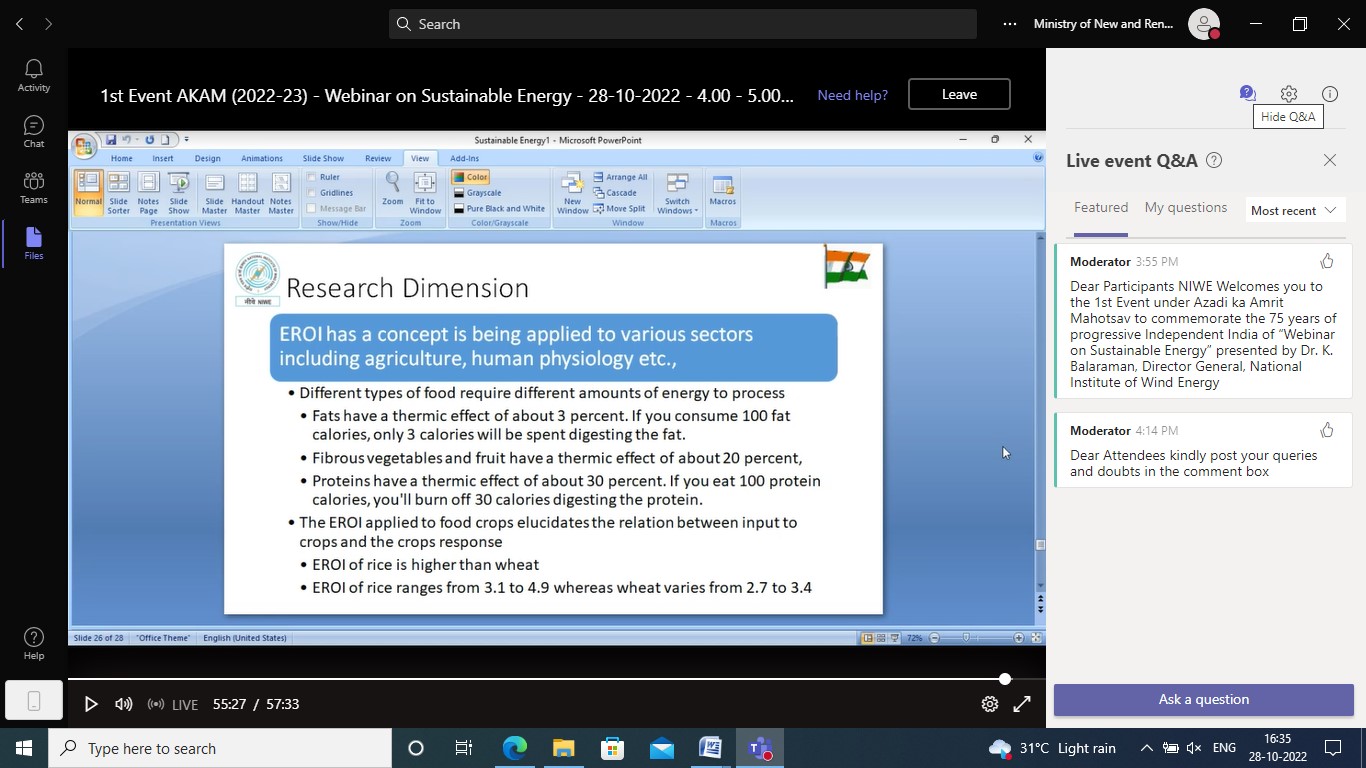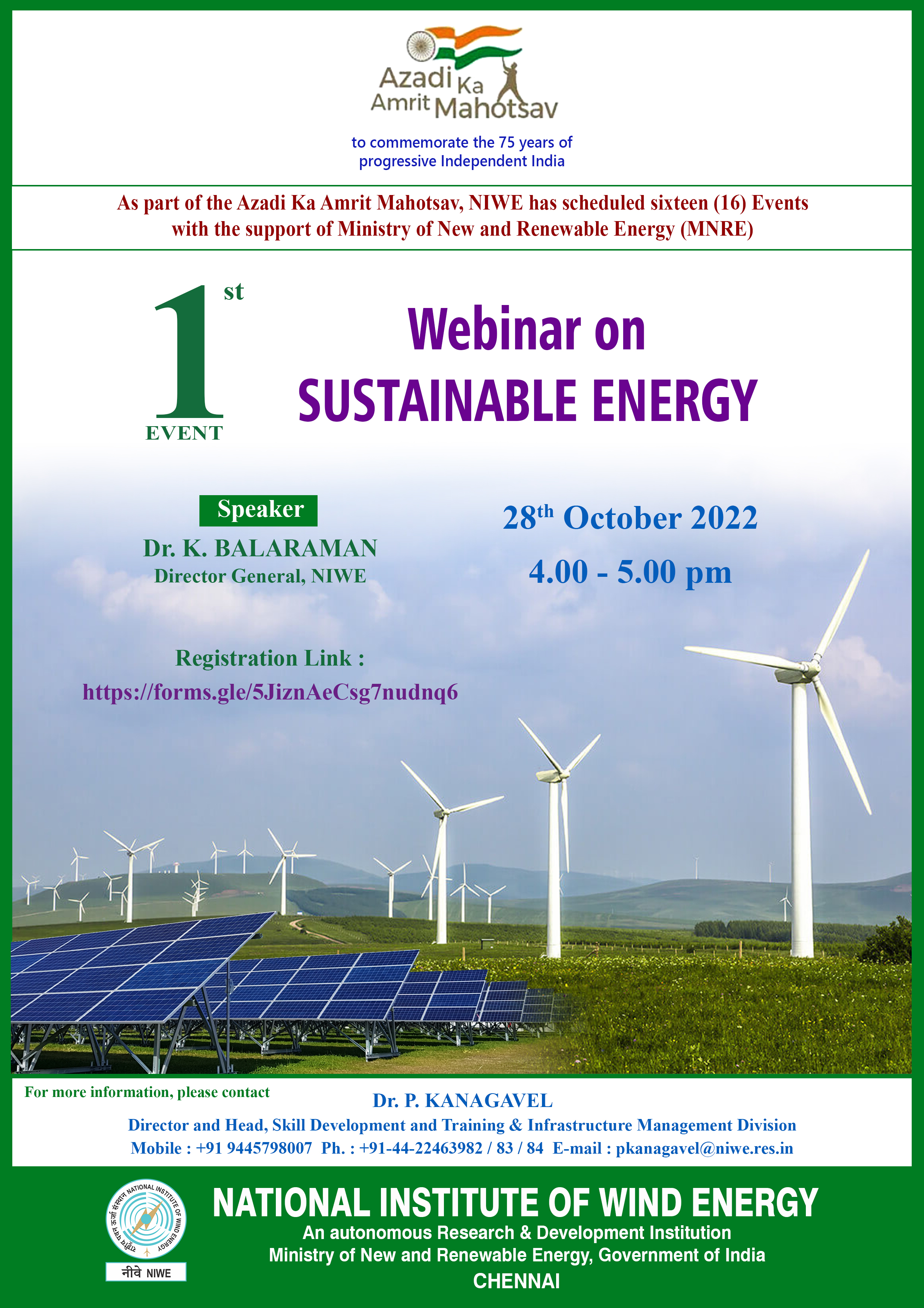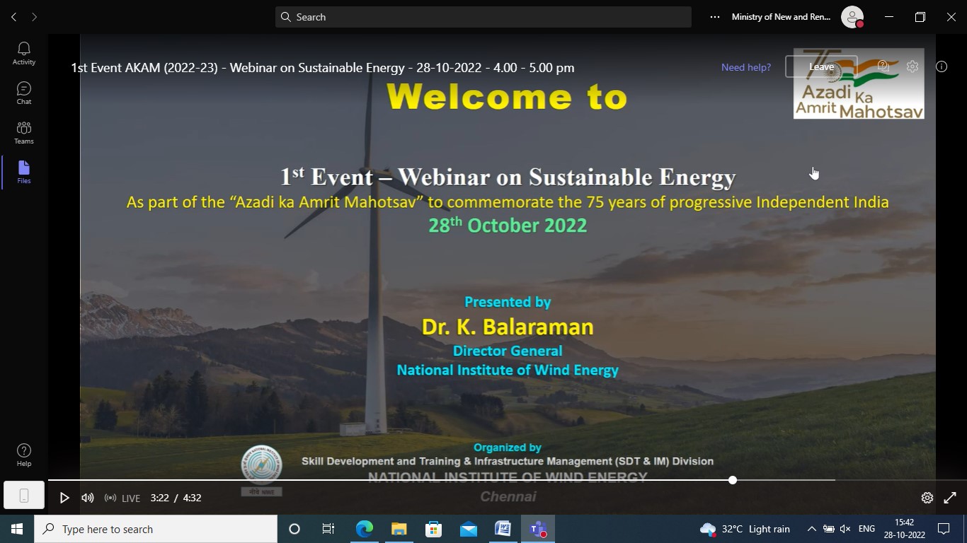 NIWE with the support of MNRE has scheduled sixteen events to commemorate 75 years of progressive Independent India (Azadi ka Amrit Mahotsav). The first event, “Webinar on Sustainable Energy” was held on 28th October 2022 and conducted successfully. The announcement about the event carrying the instructions was hosted in NIWE website and circulated through Social Media pages along with the below given Flyer.
