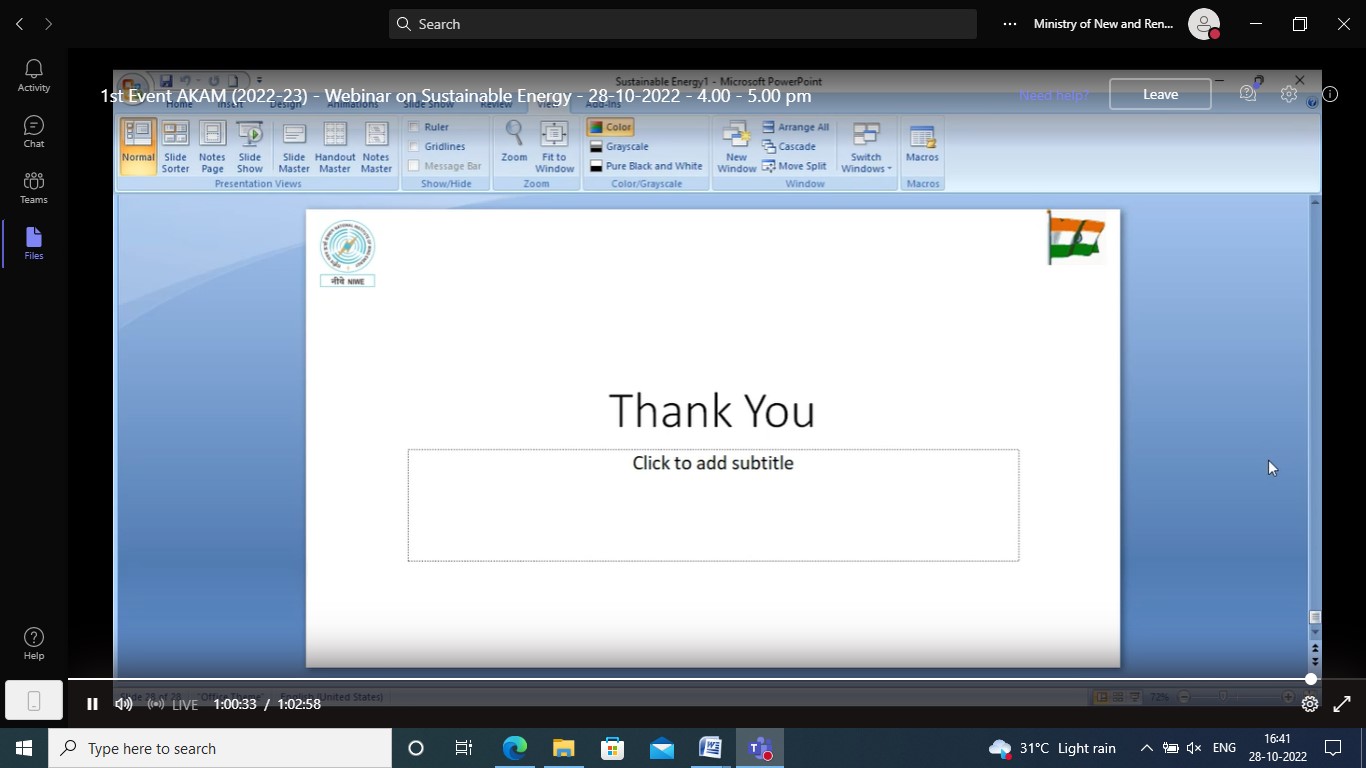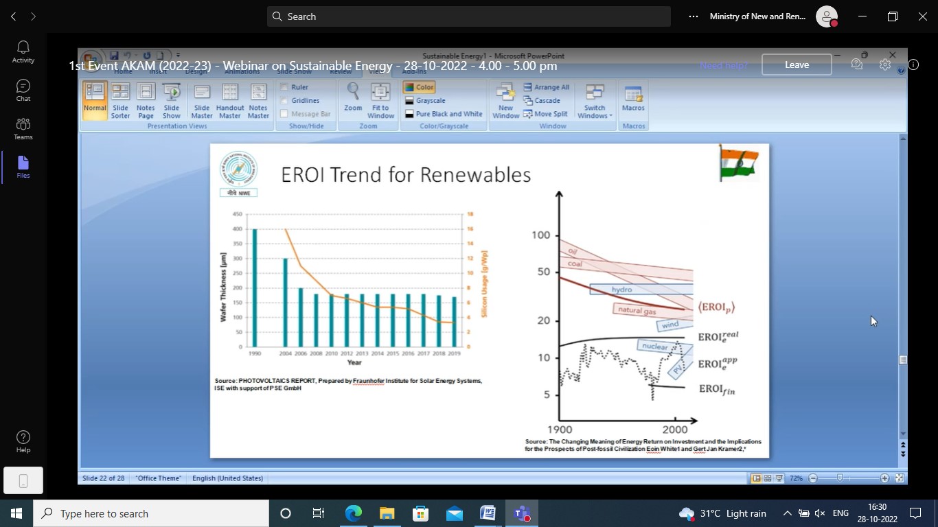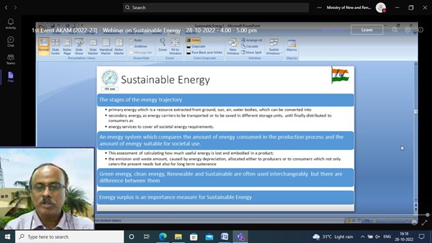 28th October 2022 | 16.00 - 17.00 | Sustainable Energy by Dr. K. Balaraman, DG, NIWE |