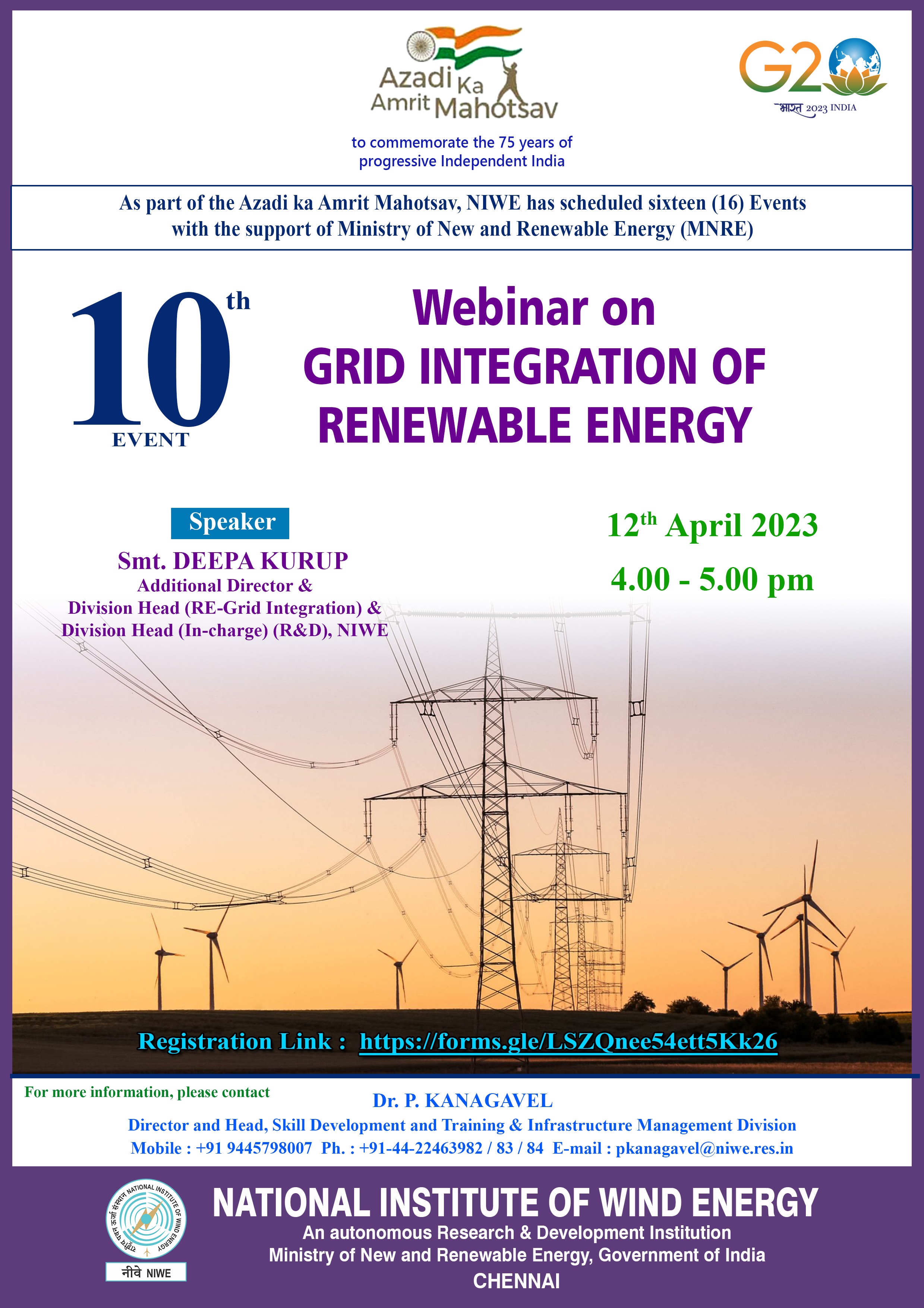 12th April 2023 | 4.00 - 5.00 pm IST | Grid Integration of Renewable Energy | Smt. DEEPA KURUP, Additional Director & Division Head (RE-Grid Integration) & Division Head (In-charge) (R&D), NIWE |