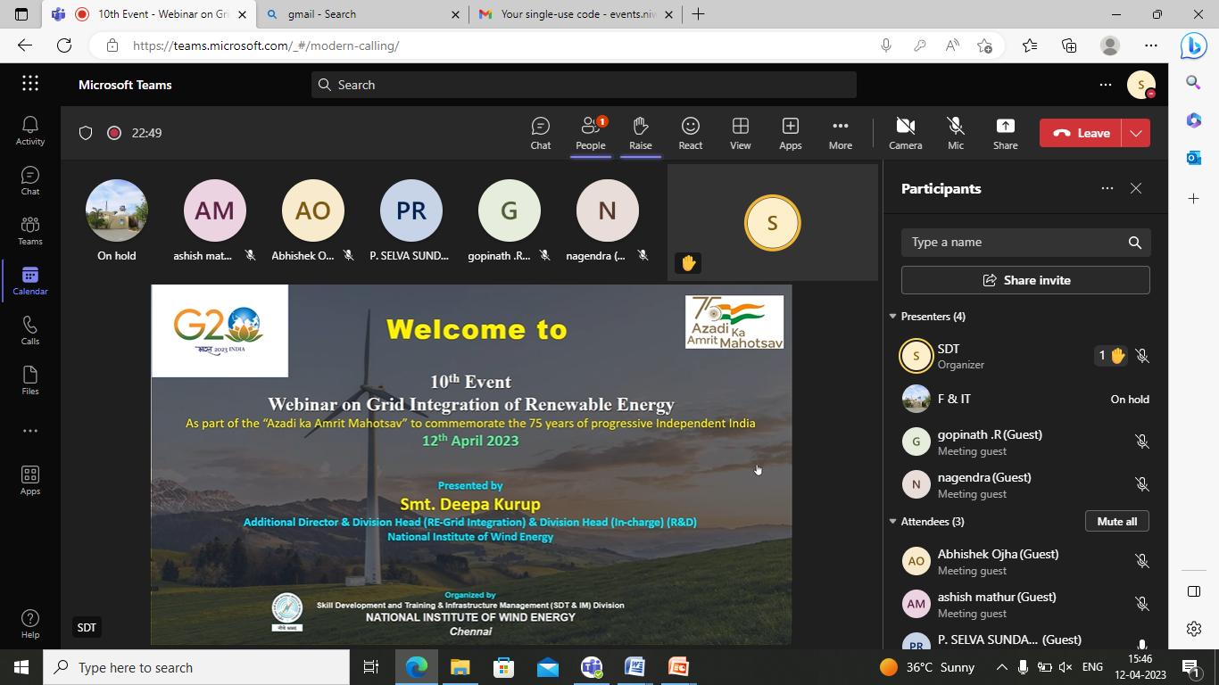 The speaker gave a detailed presentation on Grid Integration of Renewable Energy and it was followed by a Q&A session, which was open for the participants to interact with the speaker. The participants asked many doubts and queries enthusiastically. All the doubts and queries raised by the participants were clearly explained and clarified by the speaker. The participants were very much satisfied with the presentation and had reciprocated the same by appreciating and thanking the speaker. In addition, they expressed their thanks to NIWE / MNRE for hosting this webinar under the event of Azadi ka Amrit Mahotsav, which is very useful for the students and also for the industrial professionals.