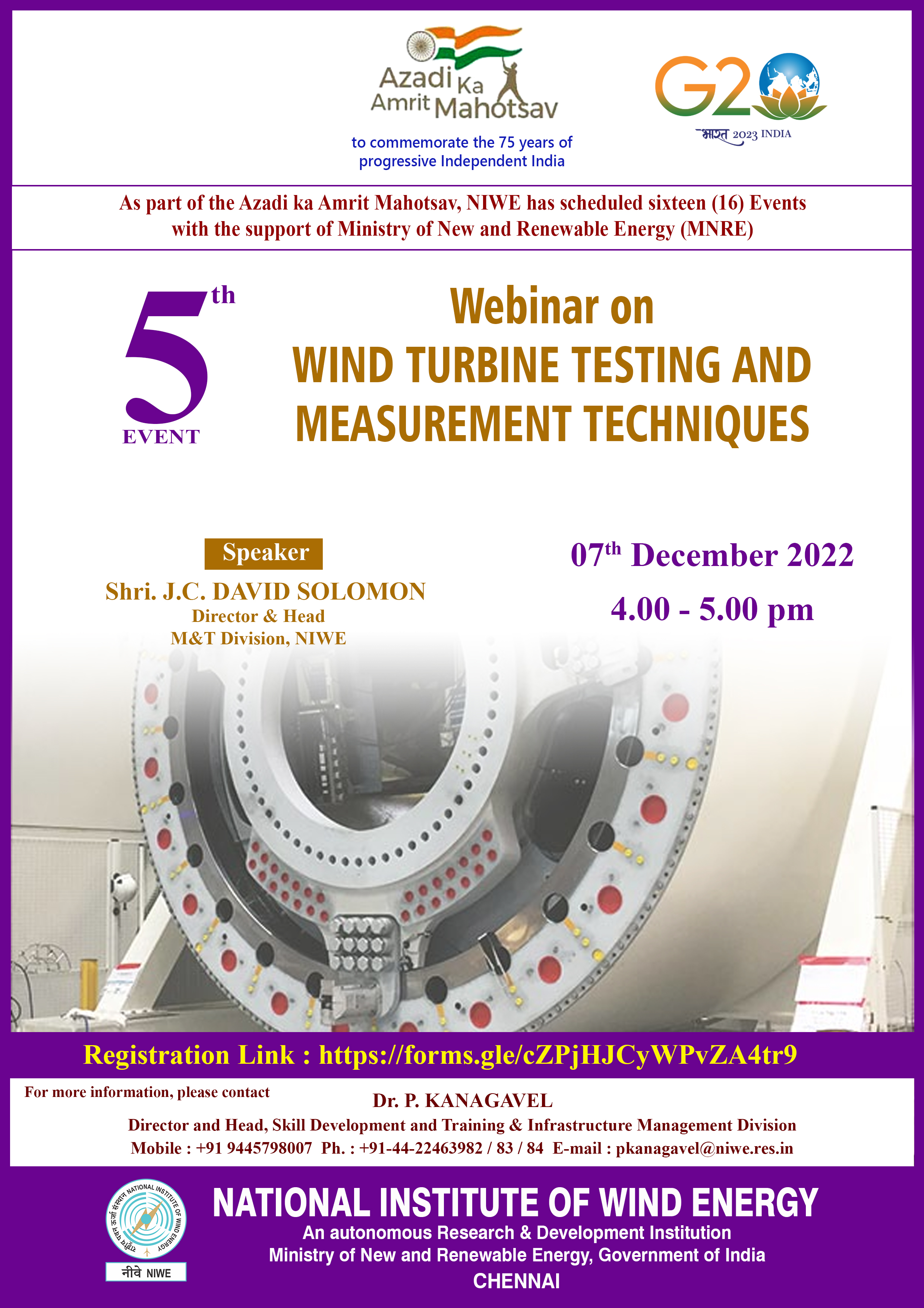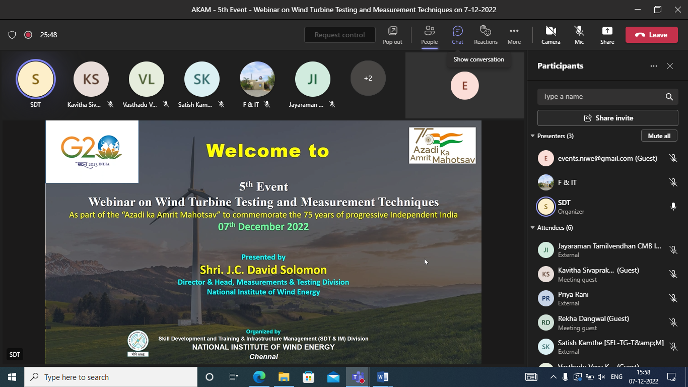 NIWE with the support of MNRE has scheduled sixteen events to commemorate 75 years of progressive Independent India (Azadi Ka Amrit Mahotsav). The fifth event, “Webinar on Wind Turbine Testing and Measurement Techniques” was successfully conducted on 07th December 2022. The announcement about the event carrying the instructions was hosted in NIWE website and circulated through Social Media pages along with the Flyer given below.