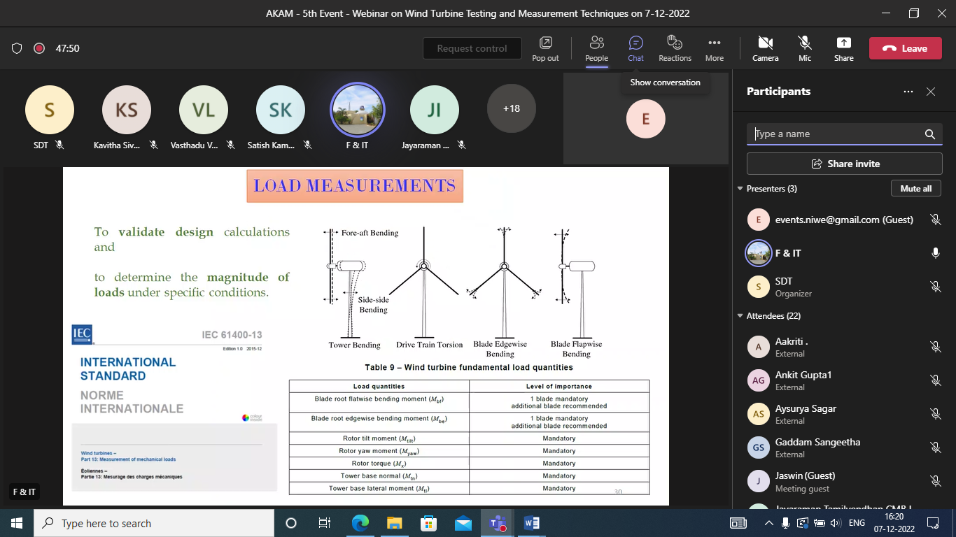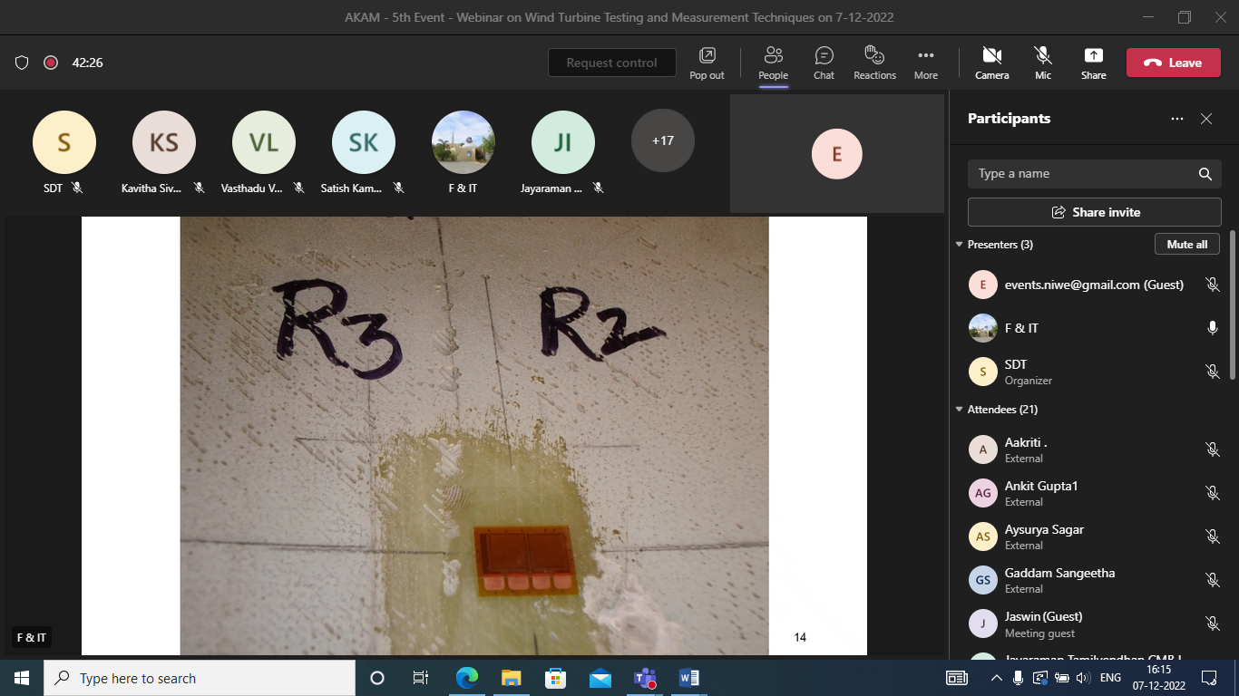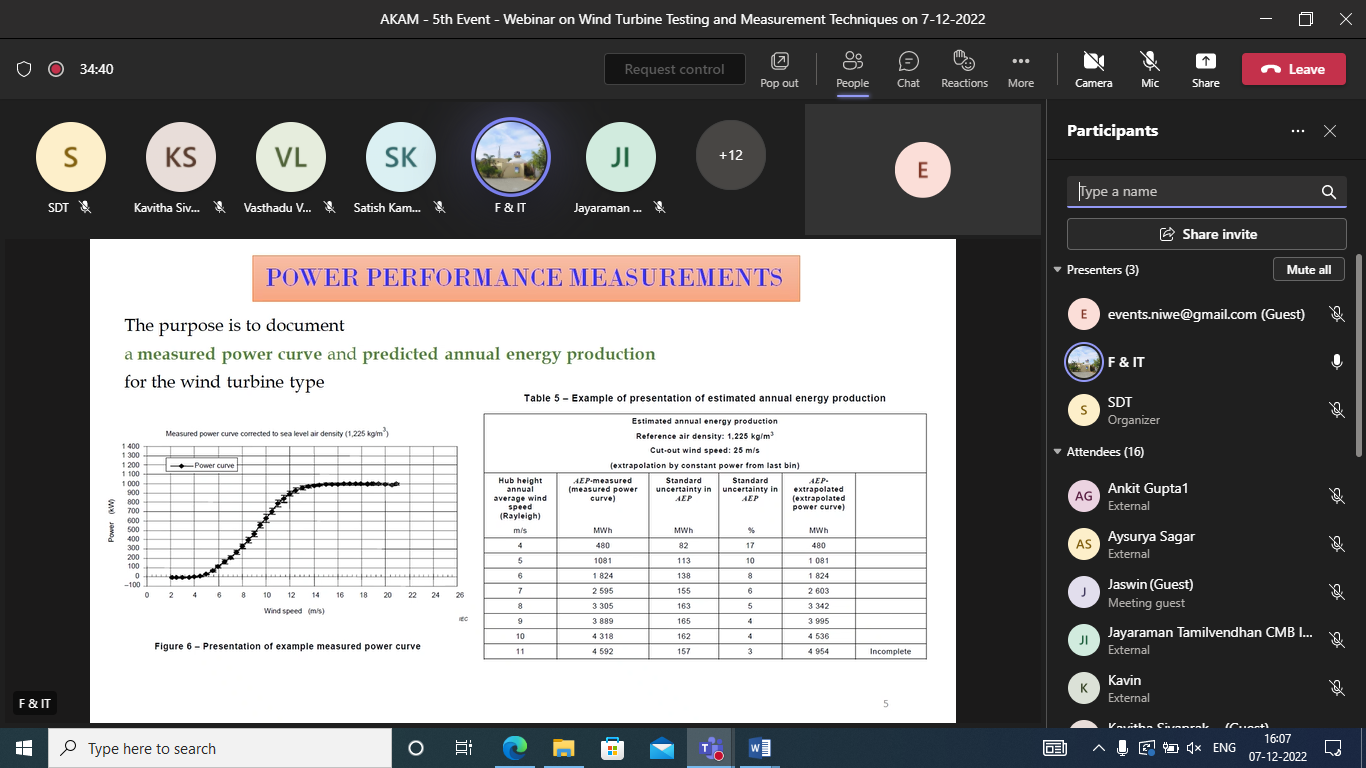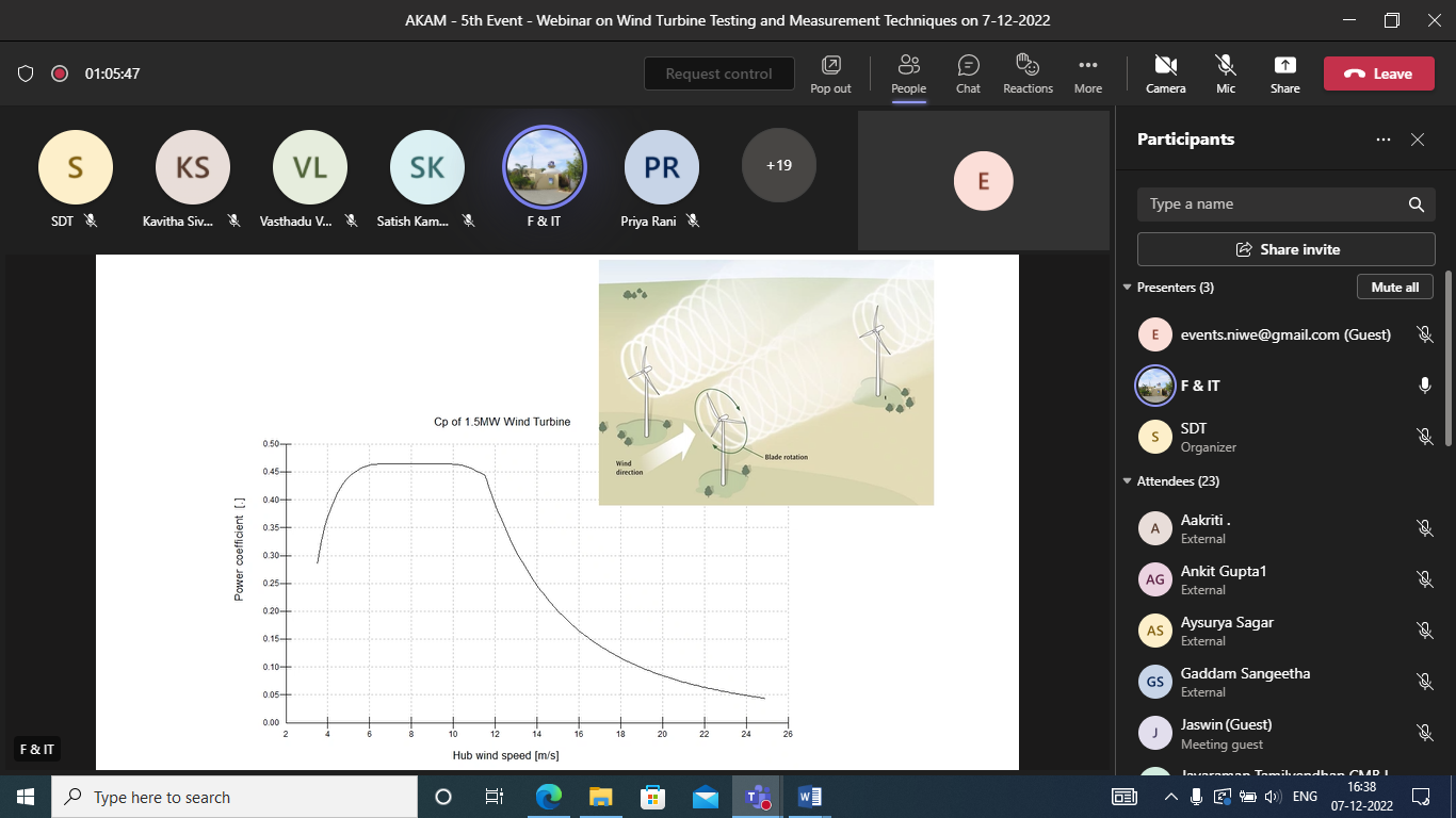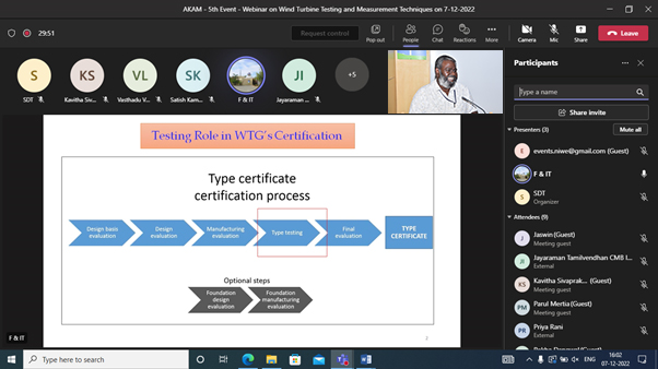 The speaker gave a detailed presentation on Wind Turbine Testing and Measurement Techniques and it was followed by a Q&A session, which was open for the participants to interact with the speaker. All the doubts and queries raised by the participants were clearly explained and clarified by the speaker. The participants were very much satisfied with the presentation and had reciprocated the same by appreciating the speaker. In addition, they expressed their thanks to NIWE for hosting this webinar.