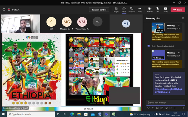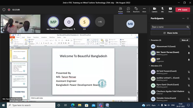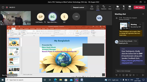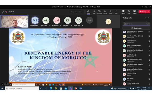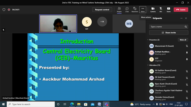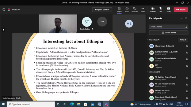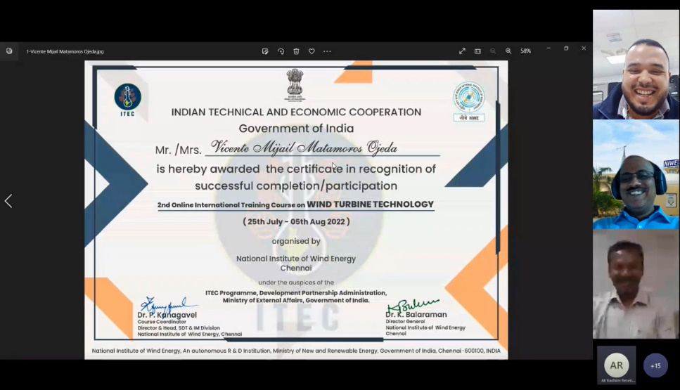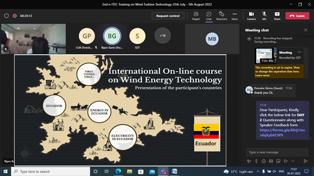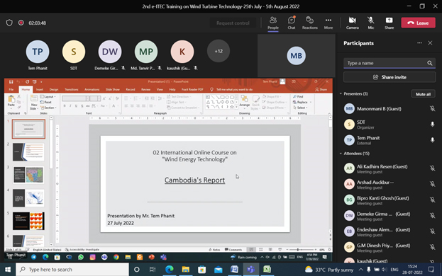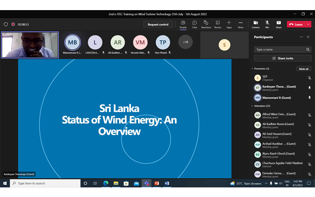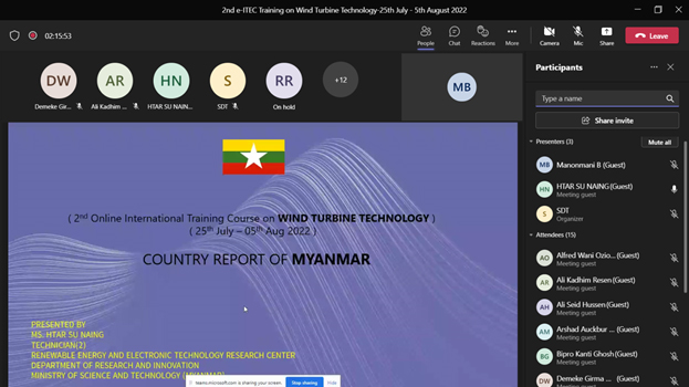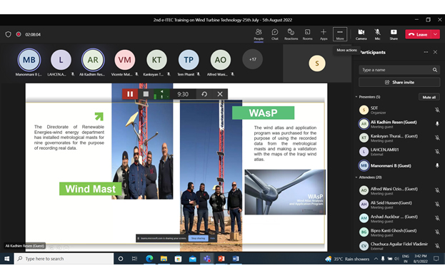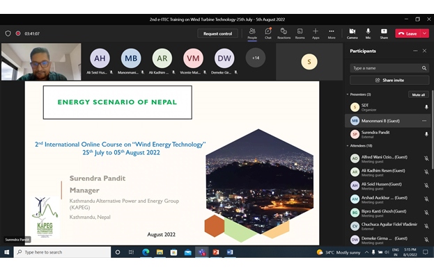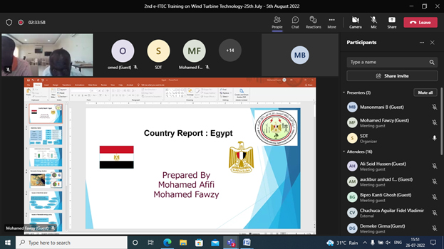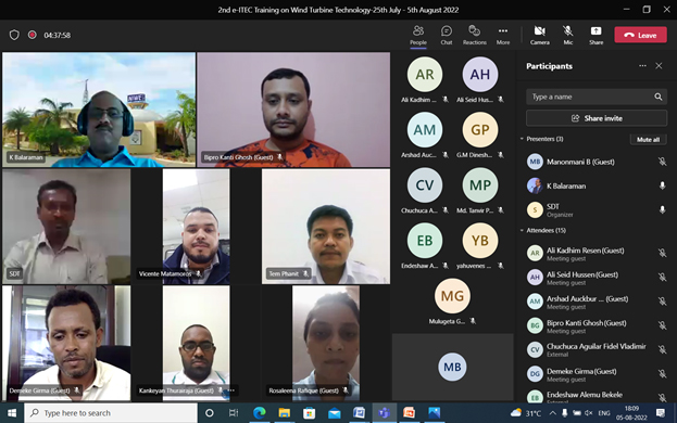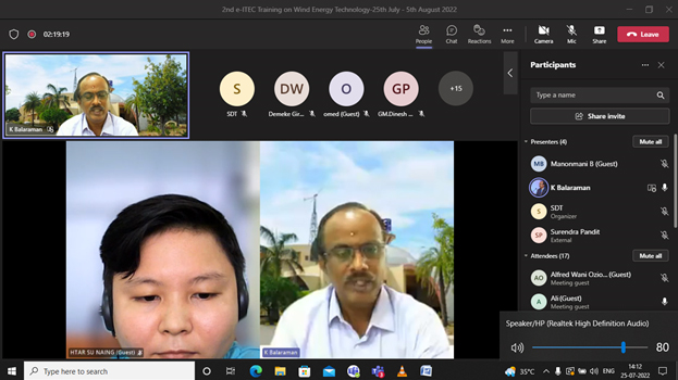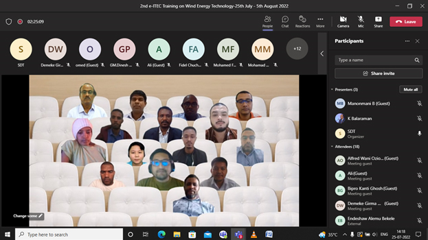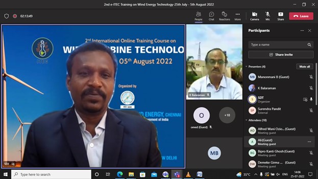 The Skill Development & Training and Infrastructure Management (SDT & IM) Division of NIWE has successfully conducted the 2nd International Online Training Course on "Wind Turbine Technology" during 25th July to 05th August 2022, sponsored by Ministry of External Affairs (MEA), Government of India under e-ITEC programme. The course addressed all aspects of Wind Power starting from introduction to wind and its technology, wind resource assessment, installation and commissioning, Grid integration, operation and maintenance of wind farms, financial and policy aspects along with testing and certification of wind turbines. The course was attended by 23 participants from 12 ITEC countries, Bangladesh, Cambodia, Ecuador, Egypt, Ethiopia, Iraq, Mauritius, Morocco, Myanmar, Nepal, South Sudan and Sri Lanka.