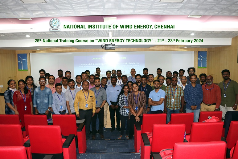The Skill Development and Training Division of NIWE organized the 25th National Training Course on "Wind Energy Technology" from 21st to 23rd February 2024 to address all aspects of Wind Power starting from introduction to wind and its technology, wind resource assessment, installation and commissioning, operation and maintenance aspects of wind farms in a focused manner along with financial and policy aspects. The course was attended by 50 participants from 9 States viz. Tamil Nadu, Delhi, Gujarat, Haryana, Jharkhand, Karnataka, Kerala, Maharashtra and Odisha. There were 44 male and 6 female participants with diverse background attended the training course.